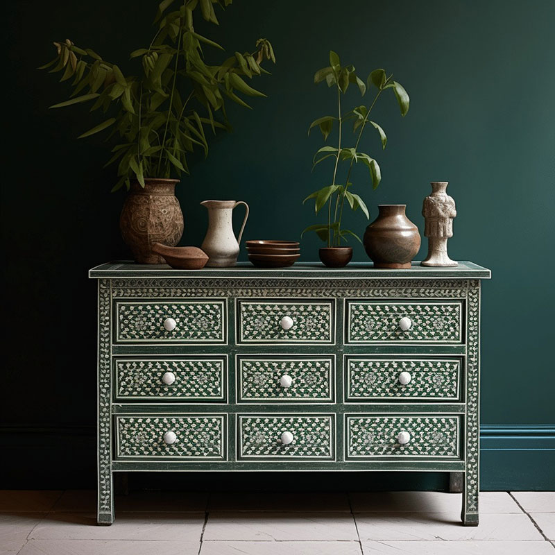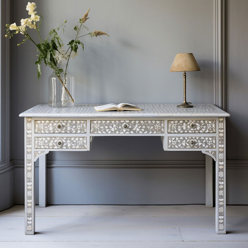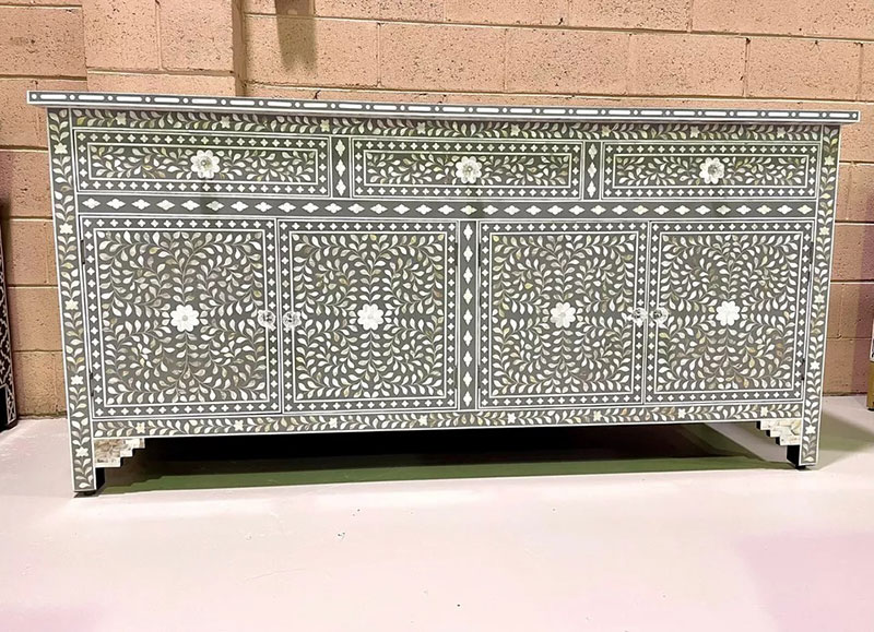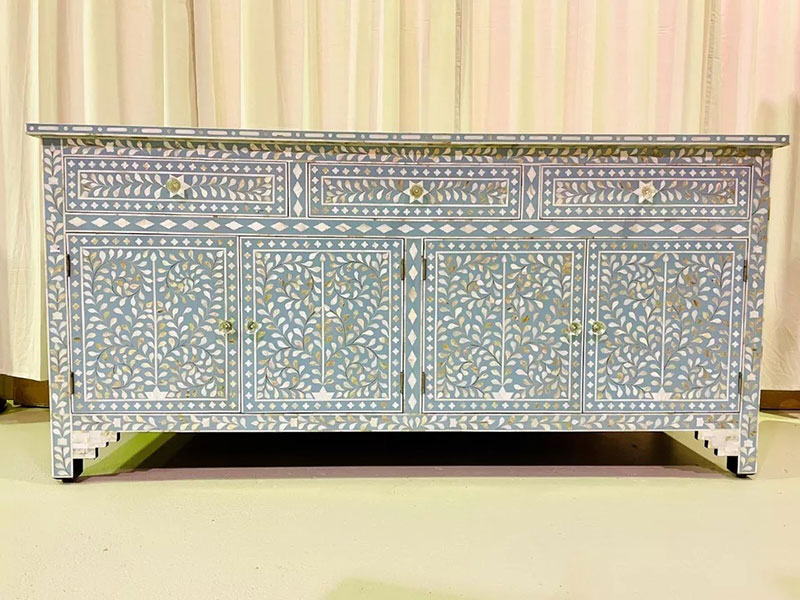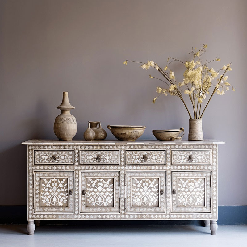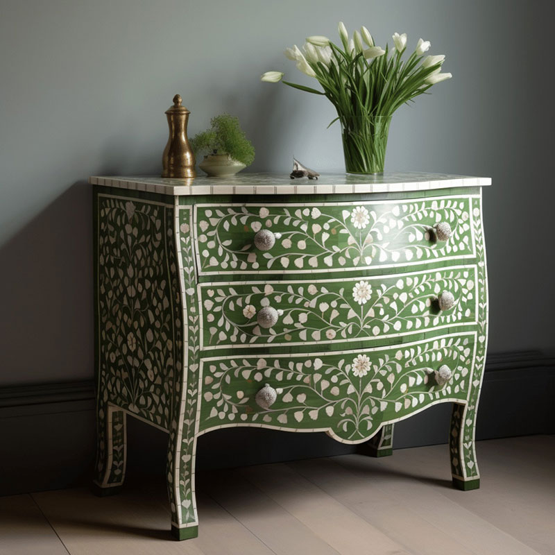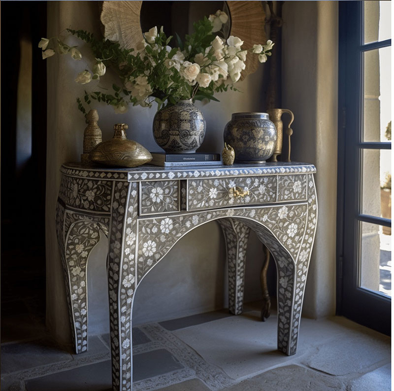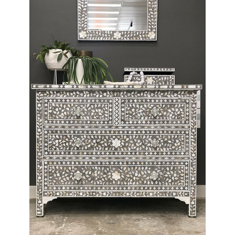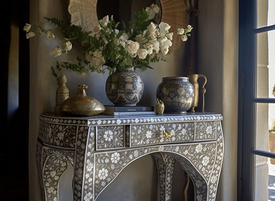 Whether you're looking for elegant furniture, statement mirrors, or decorative accessories, our MOP inlay pieces bring a touch of sophistication to any room. The shimmering effect of Mother of Pearl adds depth and elegance to both modern and traditional interiors. From intricate geometric motifs to nature-inspired designs, our collection offers a wide range of styles that cater to diverse tastes and design preferences. Every piece reflects a perfect balance of nature's beauty and superior craftsmanship, making it a lasting addition to your home or office decor.